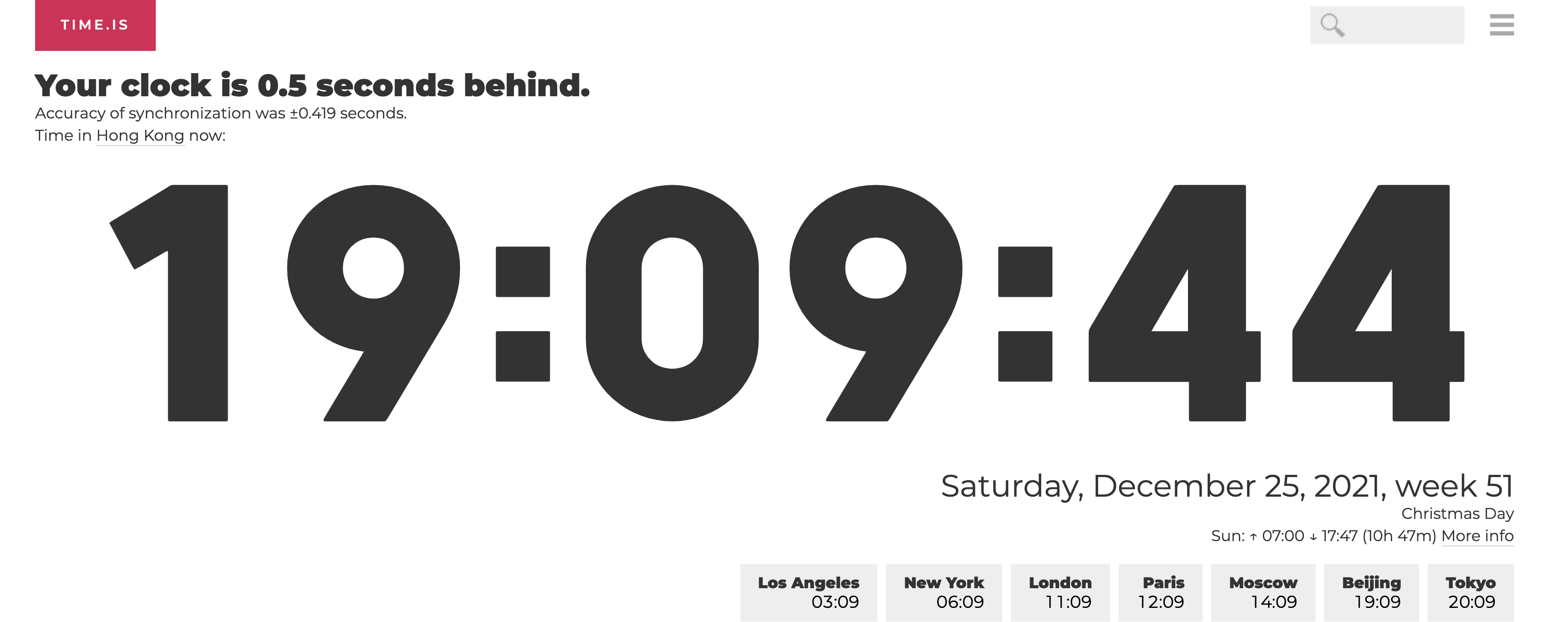 计算机或智能设备大多采用 NTP 协议来同步时间。你还可以访问 time.is 这个网站来查看你的设备与高精度原子钟的时间偏差: