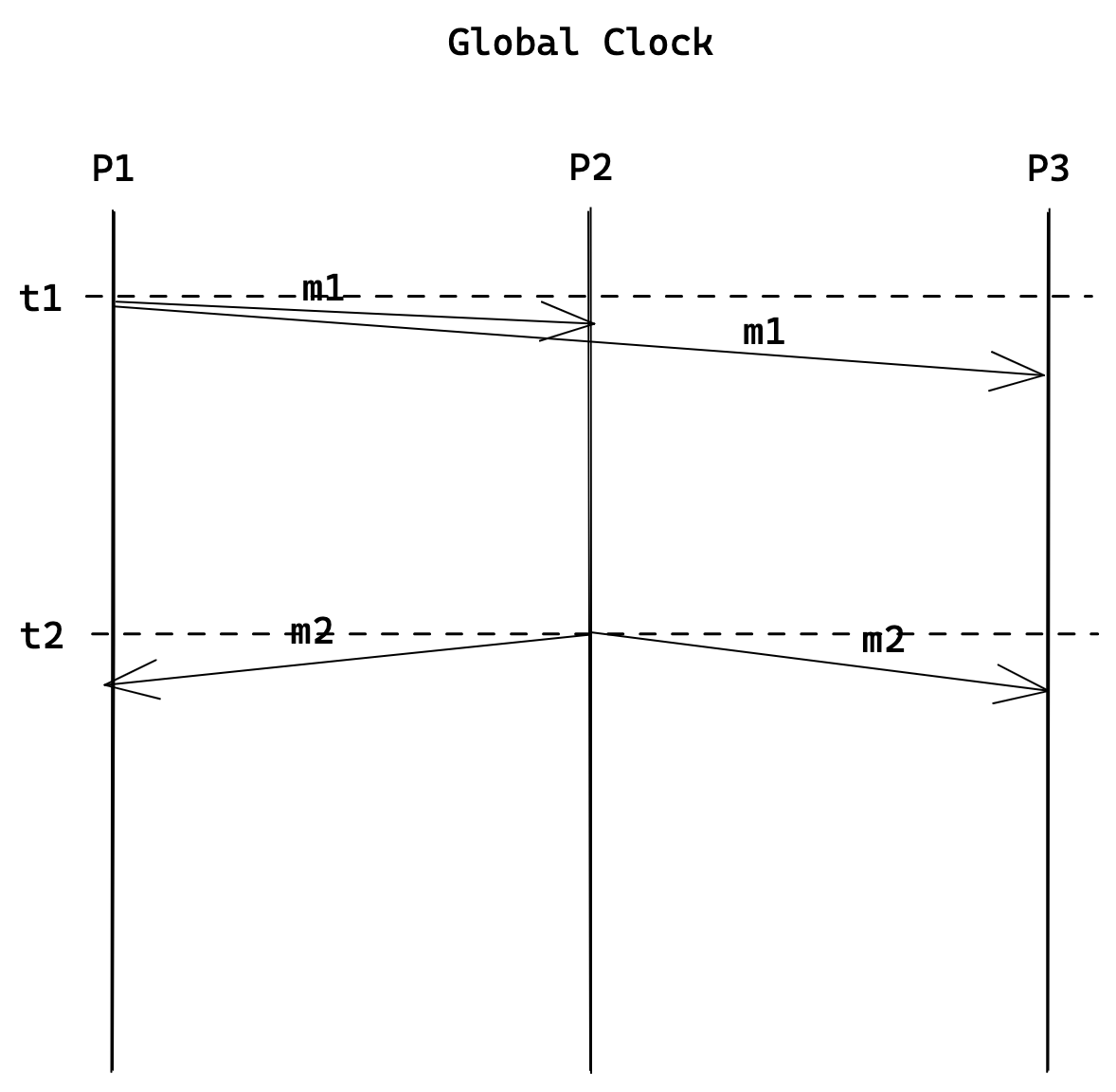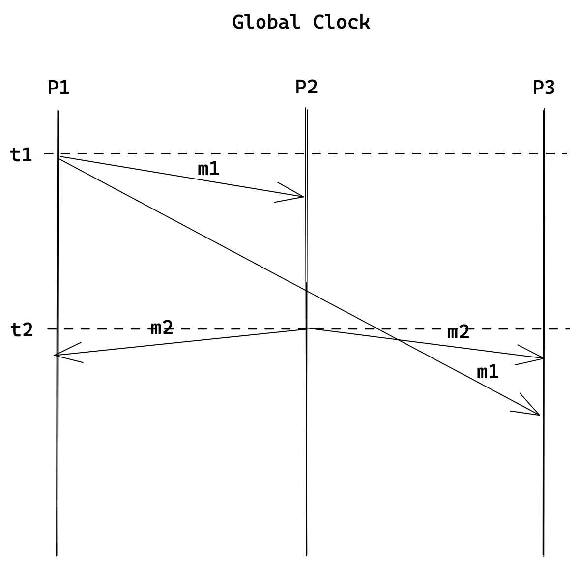如上图,当进程 P2 收到 P1 发来的消息 m1 后,经过处理之后 P2 将 m2 发送给 P1 和 P3。因为全局时钟的存在,t1 < t2,所以在 P3 进程的视角看,肯定是先收到一个 P1 发来的 m1,然后再收到一个 P2 发来的 m2。实际上,我们程序的逻辑也是 P2 收到 m1 后经过处理才生成 m2,于因果关系上,先有 m1,然后才有 m2。不可能出现 P3 先收到 m2,然后再收到 m1 的情况。