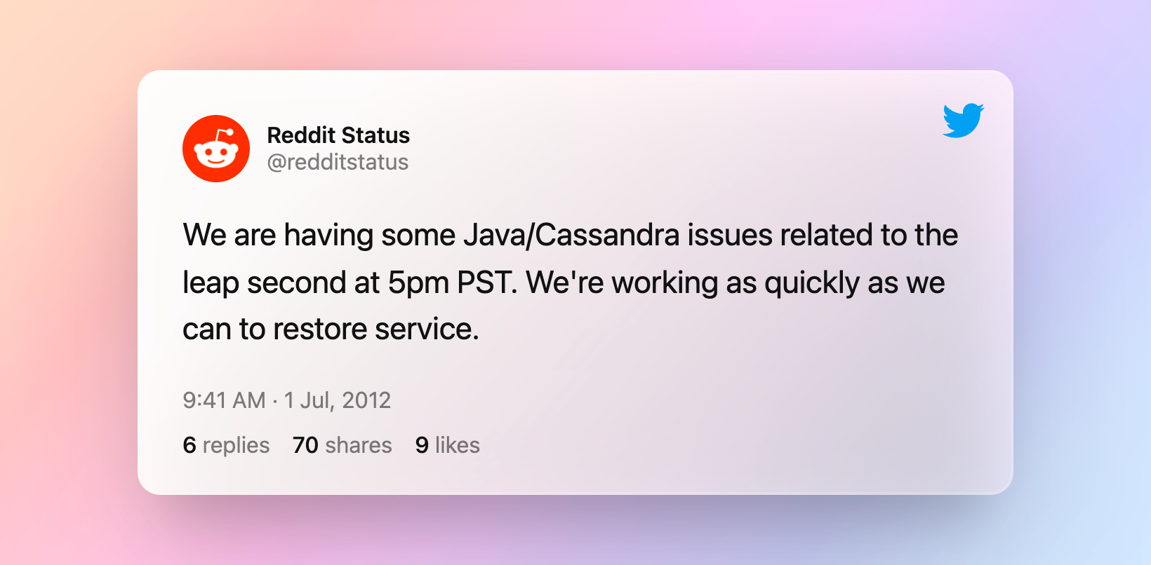 2012 年 6 月 30 日,很多互联网在线服务系统和网站突然同时宕机,包括知名的社区 Reddit: