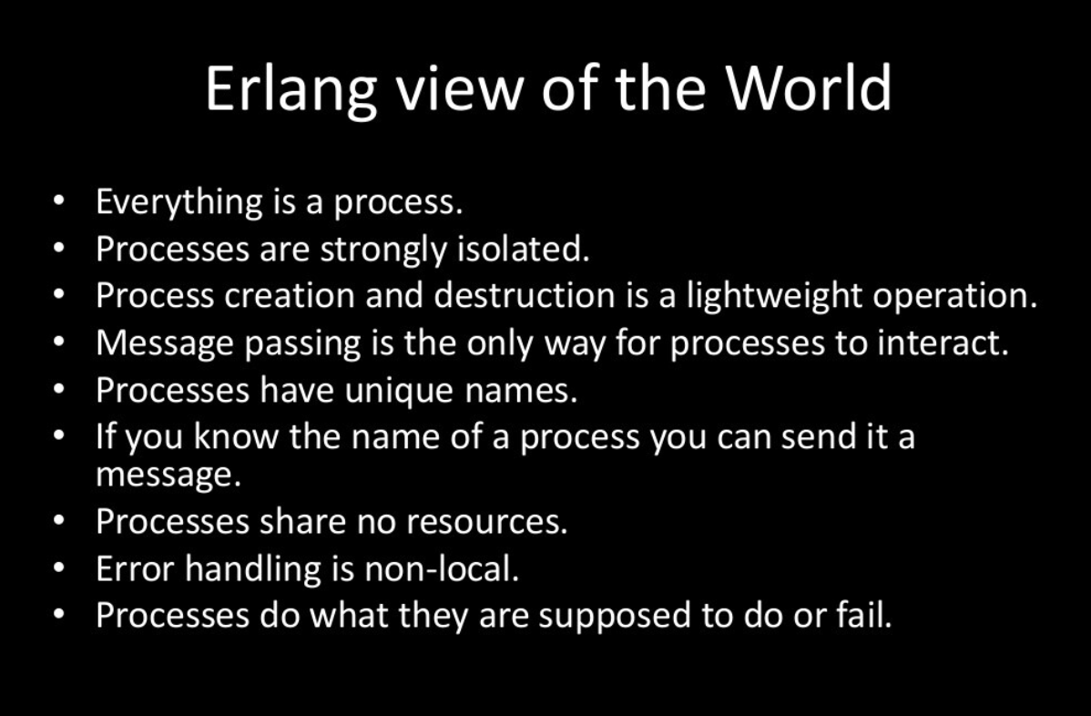 在 Erlang 的世界观里,程序是由一系列独立的进程组成的,这些进程通过消息传递(Message)来通信共享状态。消息传递的是什么?消息传递的是状态,而状态的转换是由进程来完成的。这个消息传递就是上述中的行为,从这个角度看,程序是由大量的消息传递行为(事件)组成的。