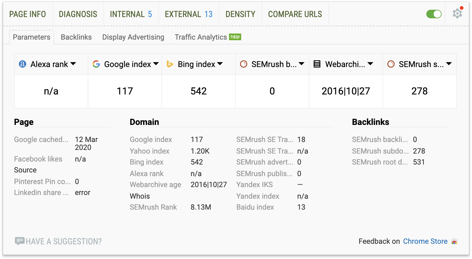反向链接的重要性毋庸置疑,这是搜索引擎对网页排名的基石,所以外链建设一直是SEO研究的重头戏。对我们SEO优化来说,了解自己的外链质量和数量很重要。我们可以通过Chrome的SEOquake插件来了解: