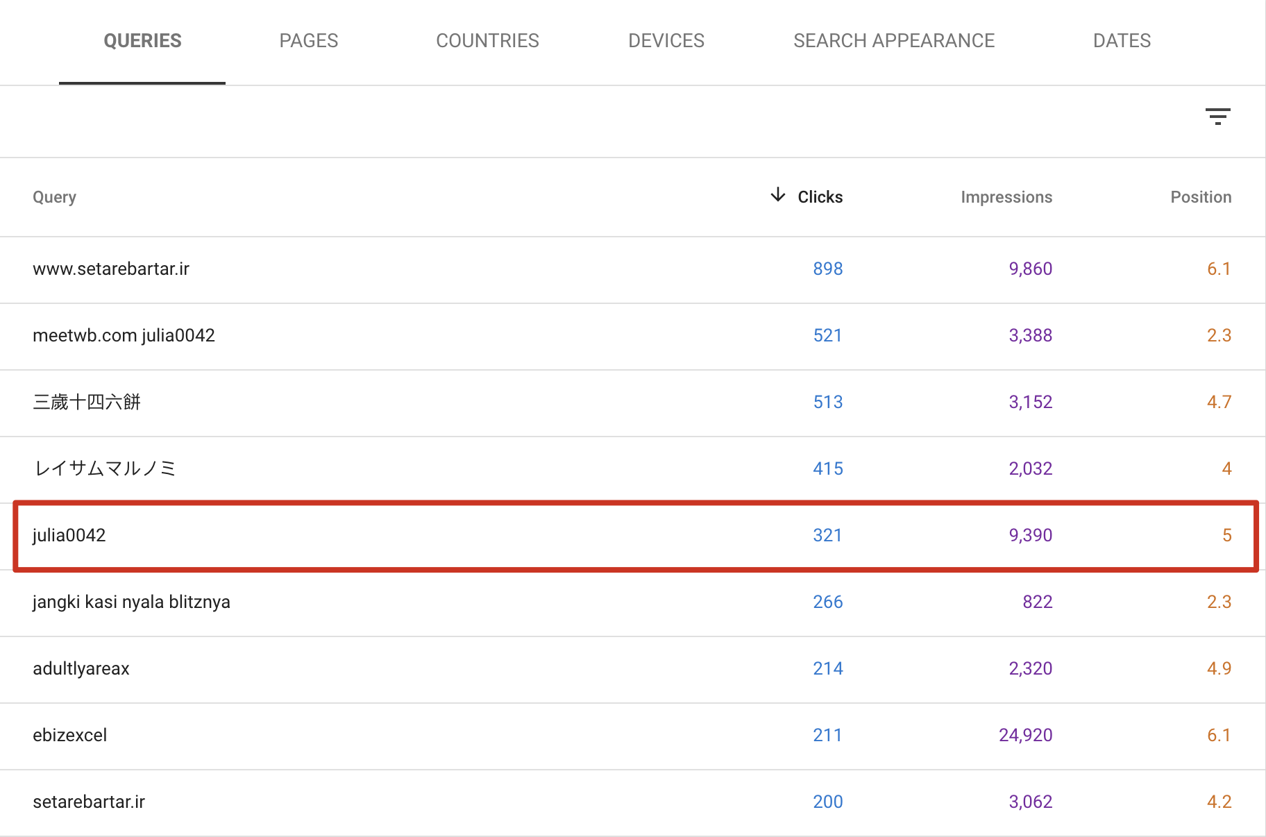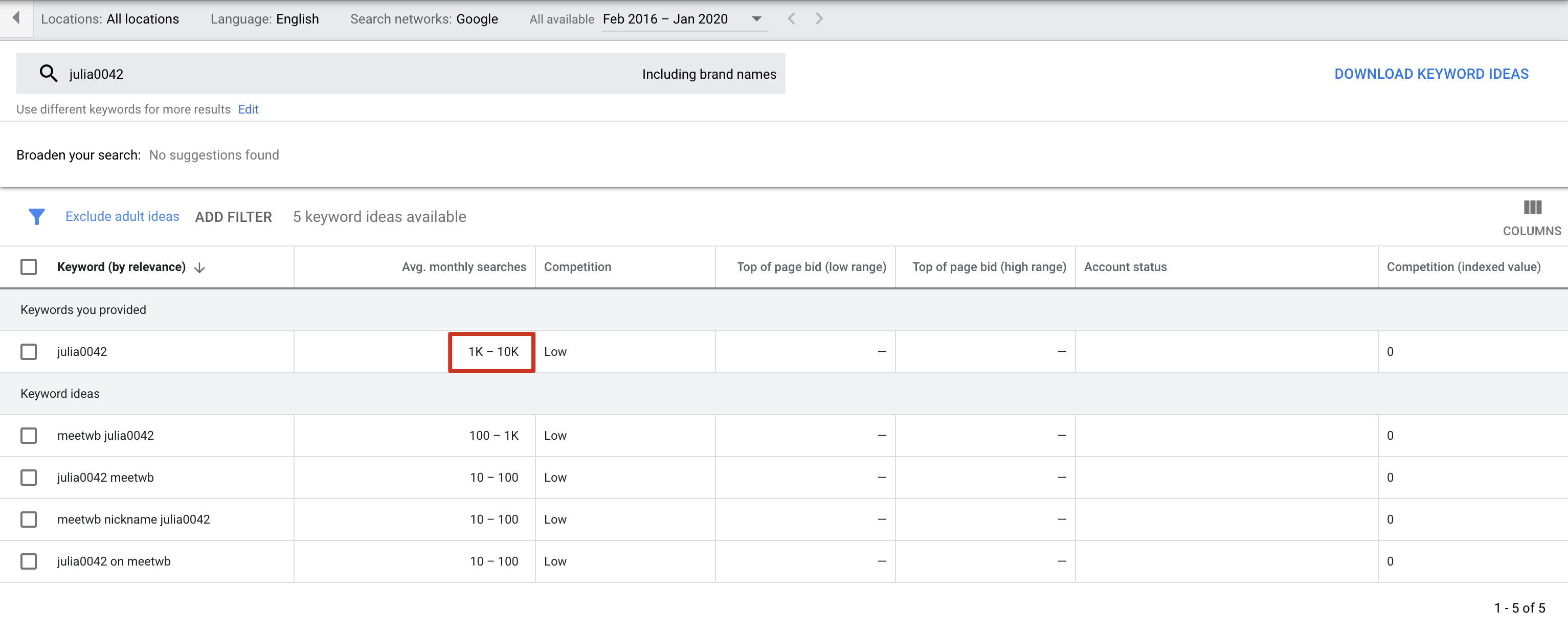 如上,以julia0042为例,这个词为我们带来了321个搜索流量,排名到第5的位置了。再查看下这个词的月搜索量: