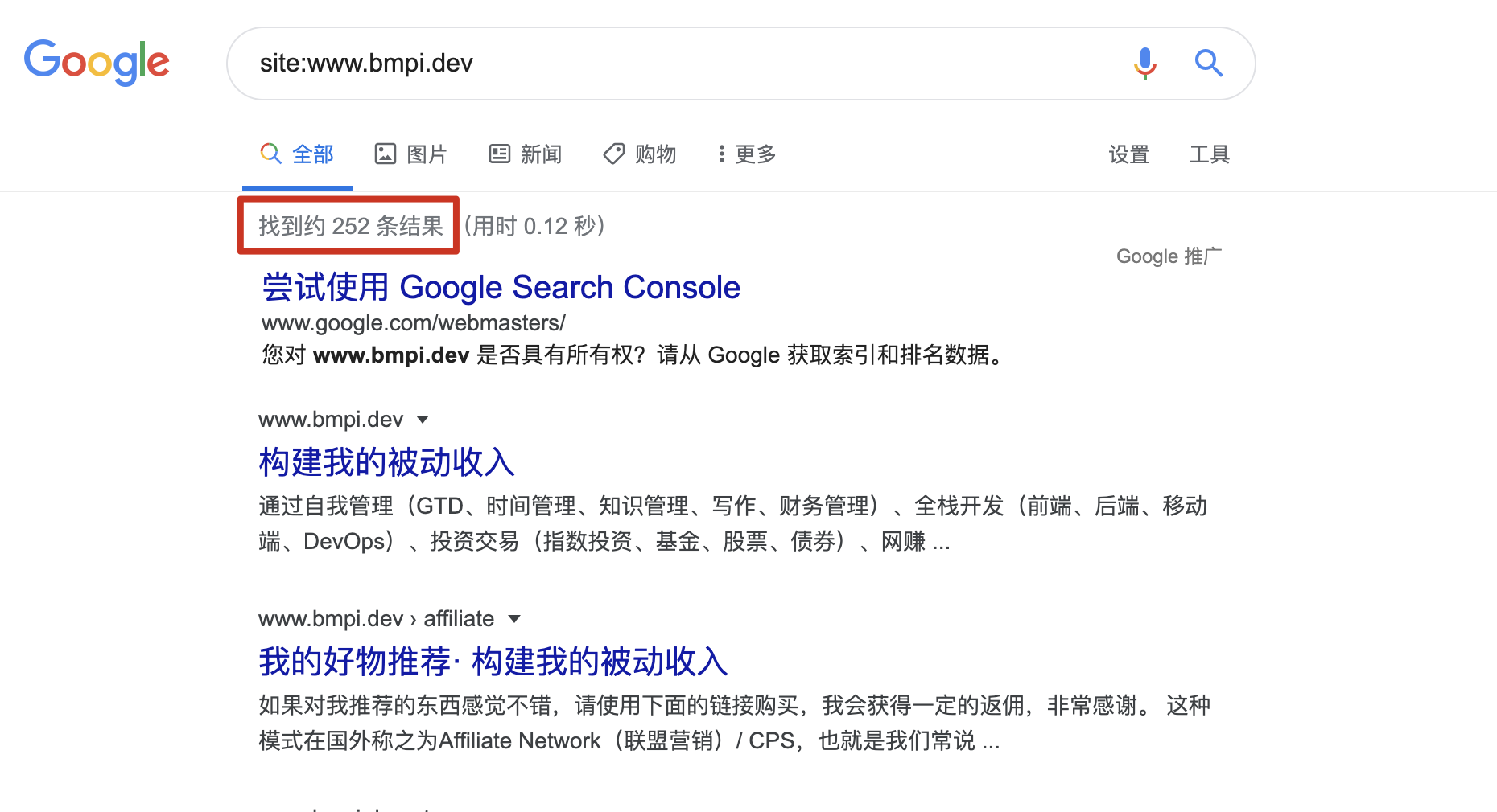 使用Google Site命令查询本站索引数量: