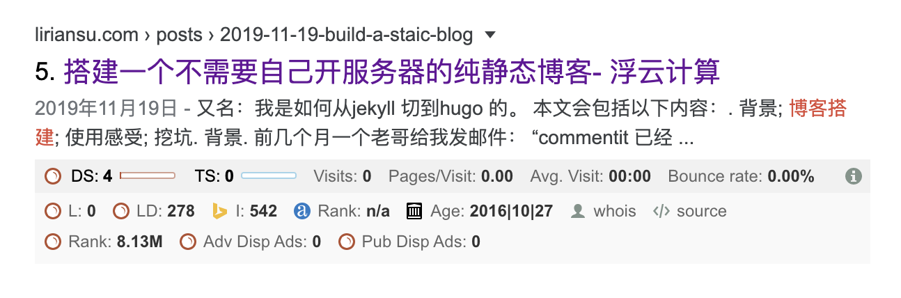 终于看到一个博客站了,而且是个小博客,虽然已经有三年多的历史了,站点总的反向链接只有不到三百个,而且这篇排名第5的文章没有任何反向链接,这对我们有一些启示: