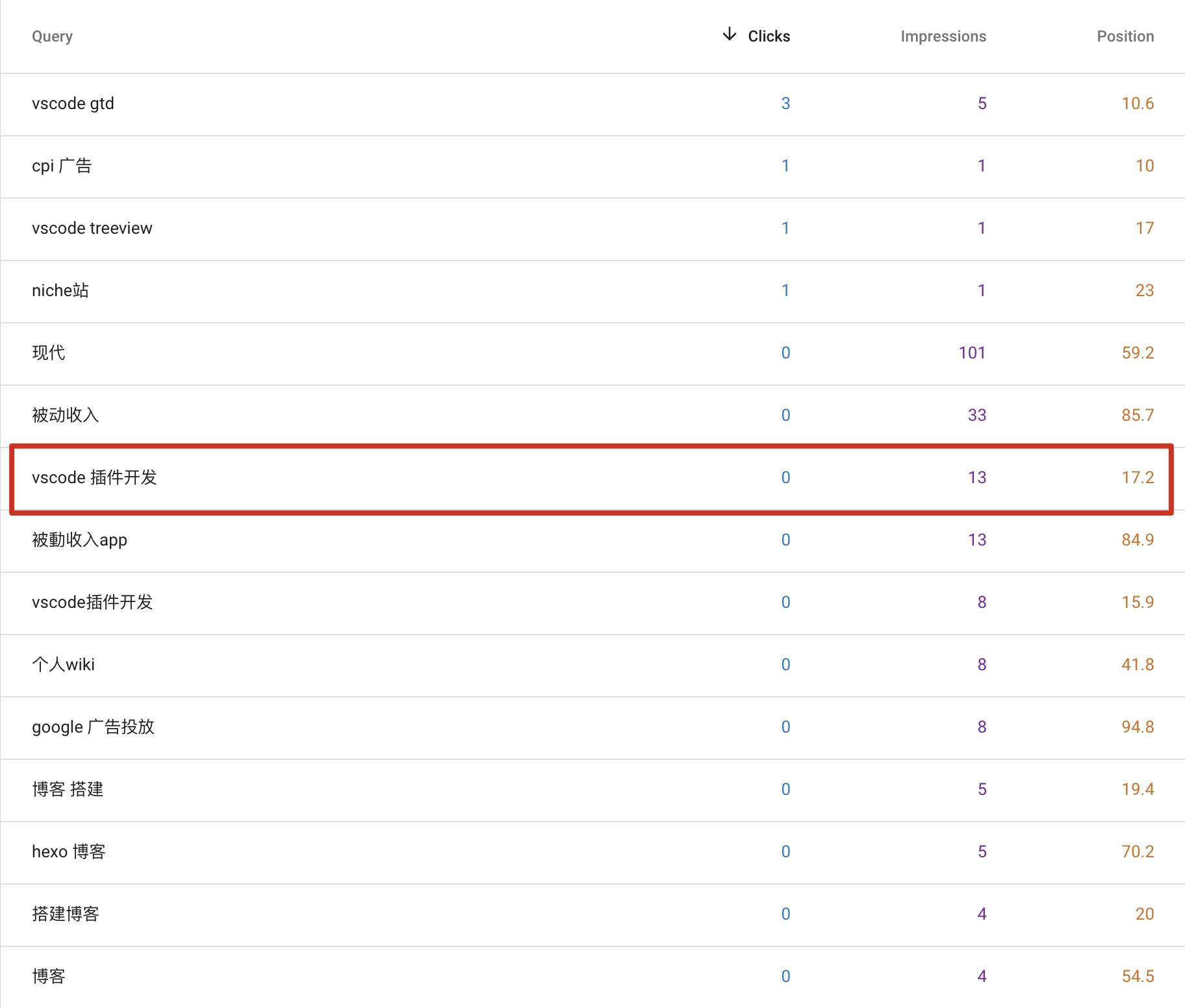 SEO流量是由很多关键词带来的流量汇聚而成。一篇文章可能包含多个核心关键词和长尾关键词,以《VSCode插件开发小记》为例,这篇文章标题包含了VSCode插件开发这个长尾词,我们在Google Search Console中可以看出这个词为博客带来了13次的展示,但是由于排名在17名,并没有带来SEO流量,如下图: