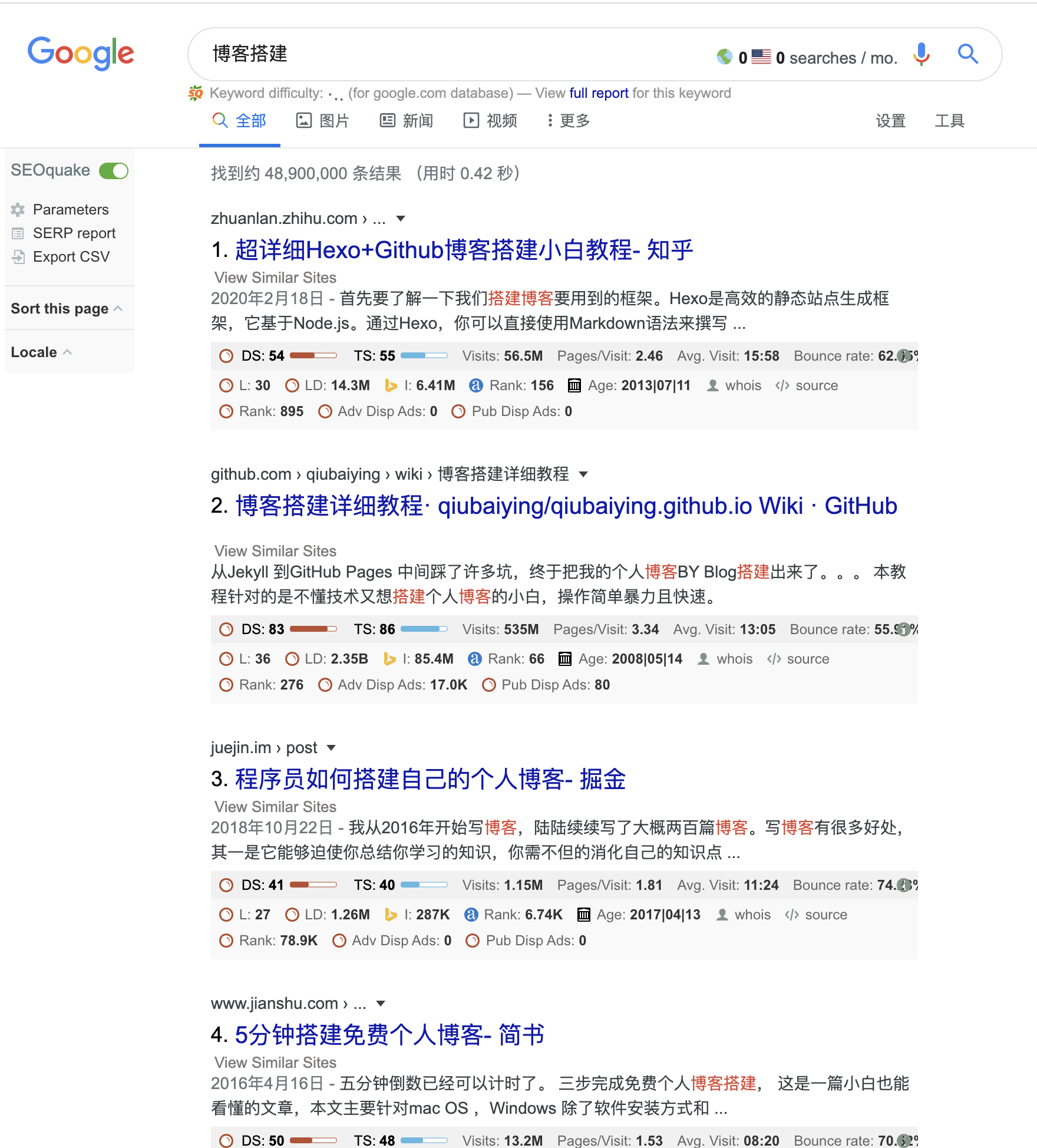 排在前四名的网站都是知乎、GitHub、掘金与简书,都是月流量上千万的大站,反向链接也都上百万了。我们个人网站是很难与这些大站竞争的,人家都是VIP玩家。继续往下看: