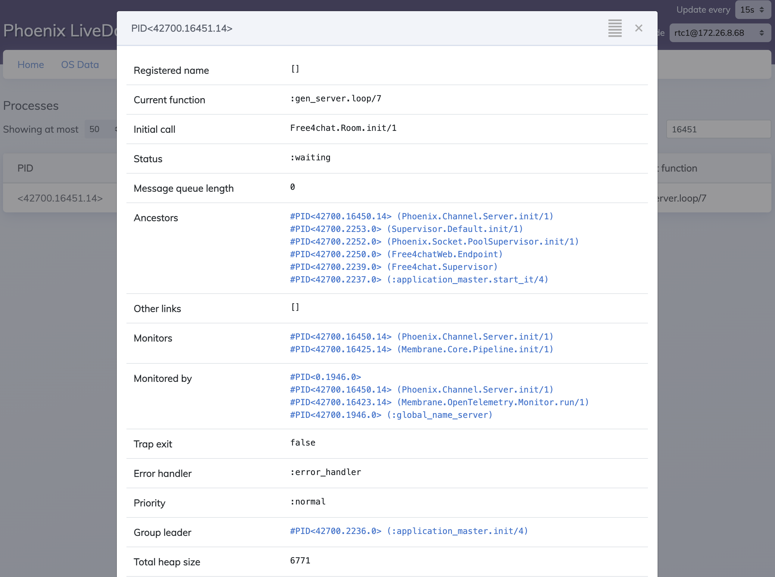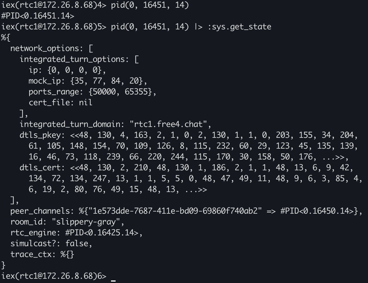 当然目前这些还不算啥惊人的部分。惊人的地方在于我们可以与这些Process在线实时交互,比如获取它们当前的状态,给它们发消息获取处理后的状态,这些在排查运行时问题时非常有帮助。比如我远程接入到集群某个节点的Erlang VM中: