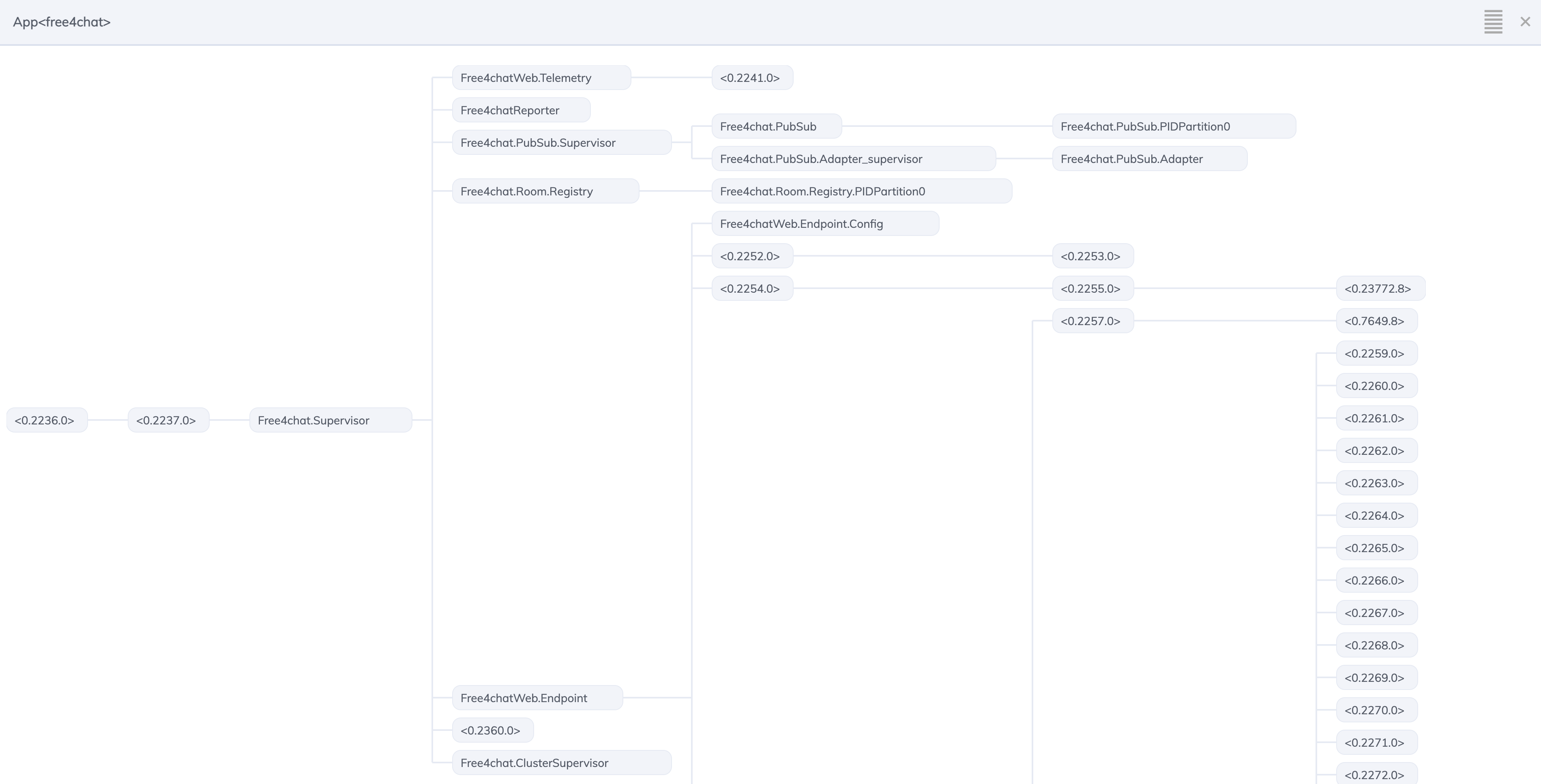 上面介绍了Tinode的集群设计,因为Tinode是用Go开发的,它的集群是自己实现的。但用Elixir就不需要这么复杂了,free4chat是我开发的一个开源的基于WebRTC的语音聊天室Web应用,它是基于Elixir开发的,目前服务端是两个节点的集群,上面的截图就是来自它的Elixir后端集群。