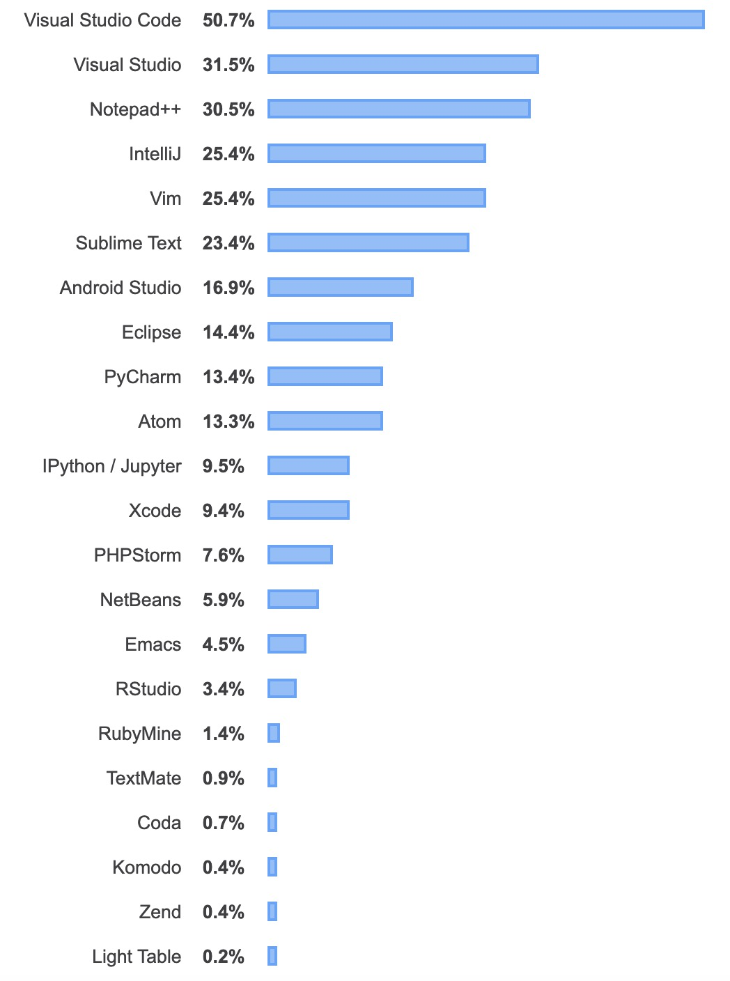 在2019年的Stack Overflow组织的开发者调研中,VS Code被认为是最受开发者欢迎的开发环境,据调查87317名受访者中有50.7%的受访者声称正在使用VS Code1。