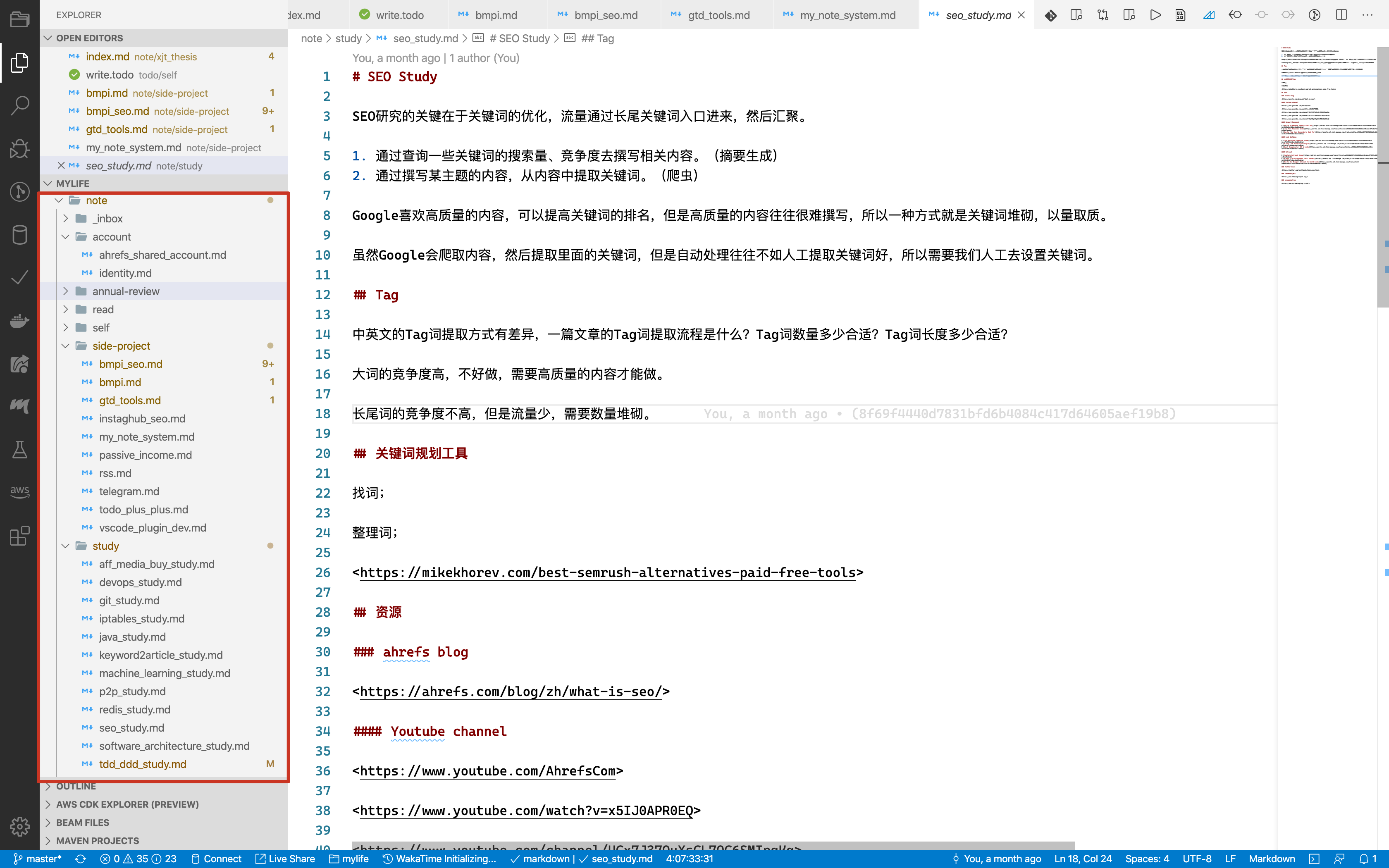 如上图红框,我一般将某个主题相关的笔记用一个Markdown记录,放入相应类别的目录。比如学习类别中,关于SEO的学习资料都会放入seo_study.md,所有学习的md文件都放入study目录。