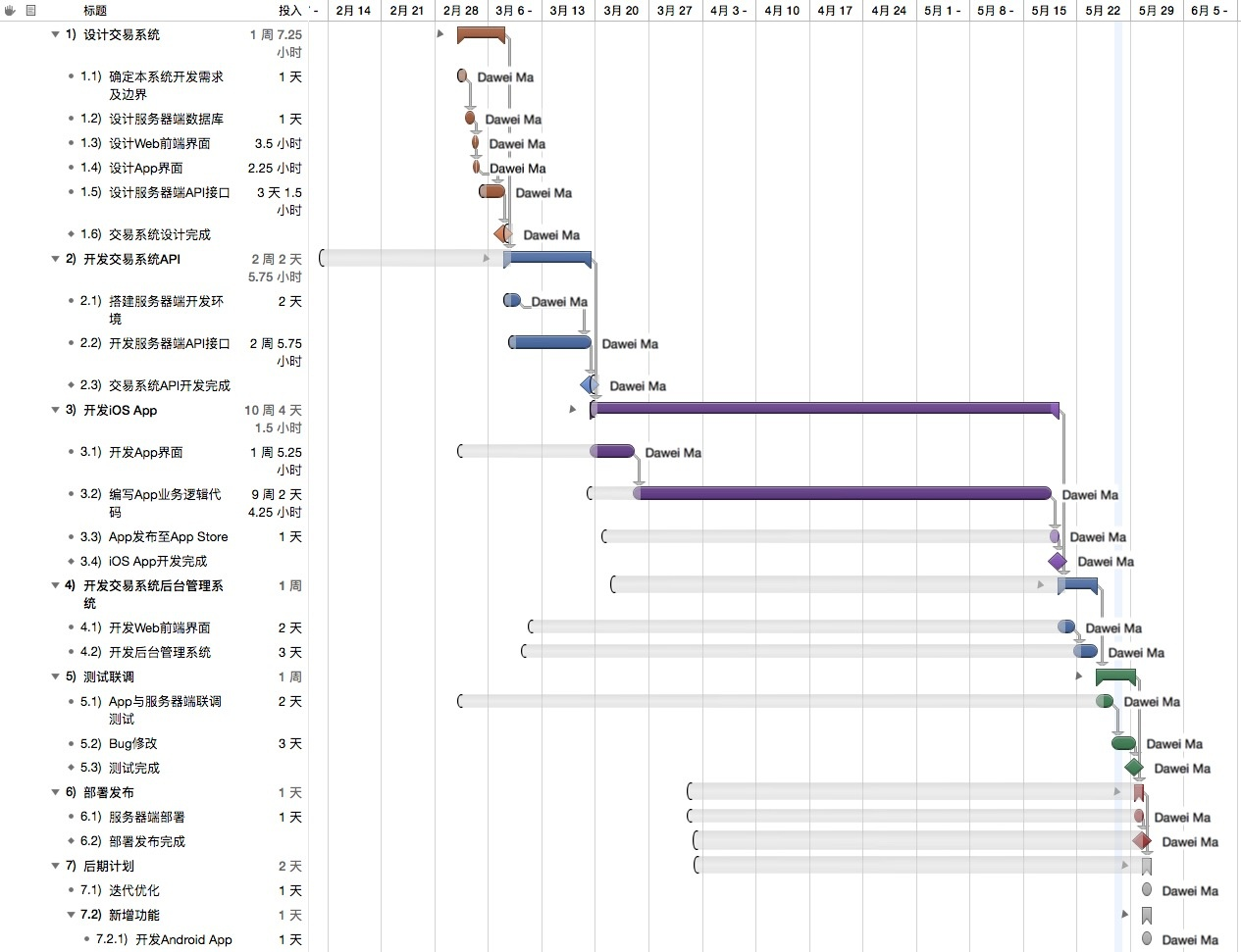 整个项目计划管理是用OmniPlan制作的。APP开发花的时间最长,因为我使用了Apple的Swift开发语言,算是一遍学习一遍来开发,所以进度要比计划的慢一些。