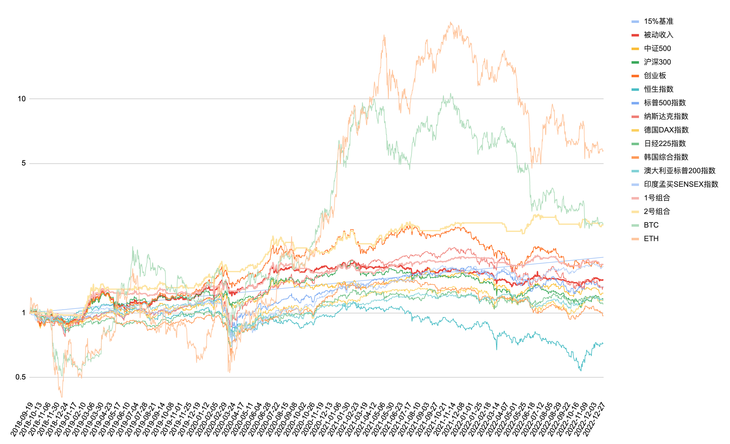 从整个组合的交易周期看,与全球市场主流指数对比,被动收入组合目前排名还不错,仅创业板、印度孟买、1号组合、2号组合、BTC与ETH比其净值高,这得益于今年好的亏损控制能力。
