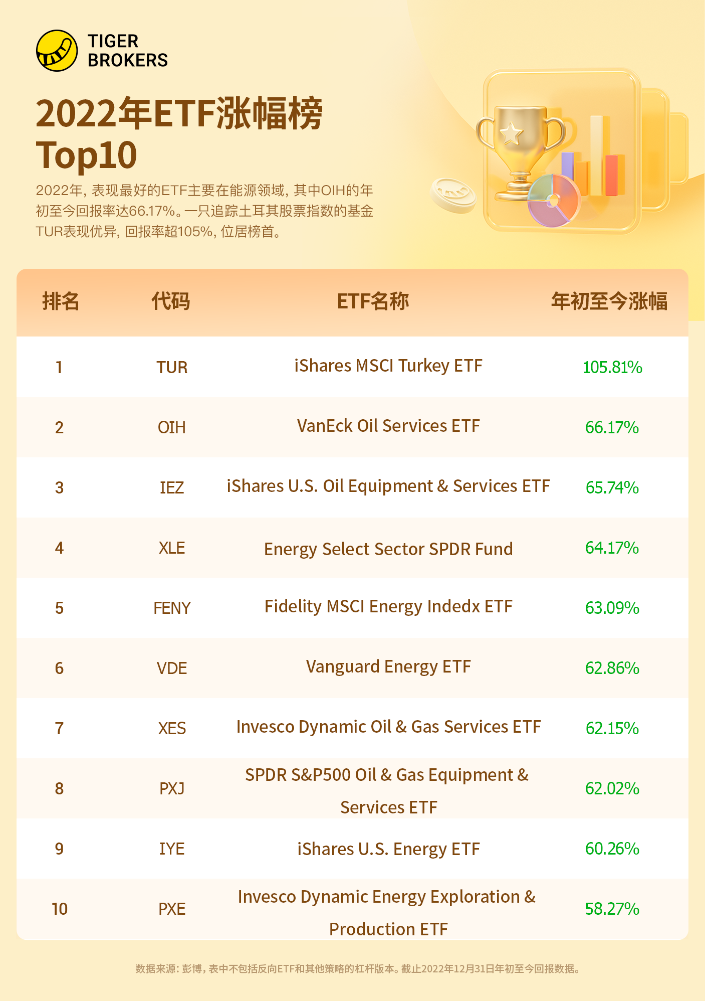 今年全球市场ETF中表现最好的是土耳其的TUR,但这种表现是建立在土耳其国内通货膨胀达80%以上的背景下,这种情况下,不难理解,TUR的巨大涨幅很多都是通货膨胀的带来的。另外涨幅超60%的ETF大多都是大宗商品类的ETF如石油和天然气,商品ETF暴涨的推手正是俄乌战争。
