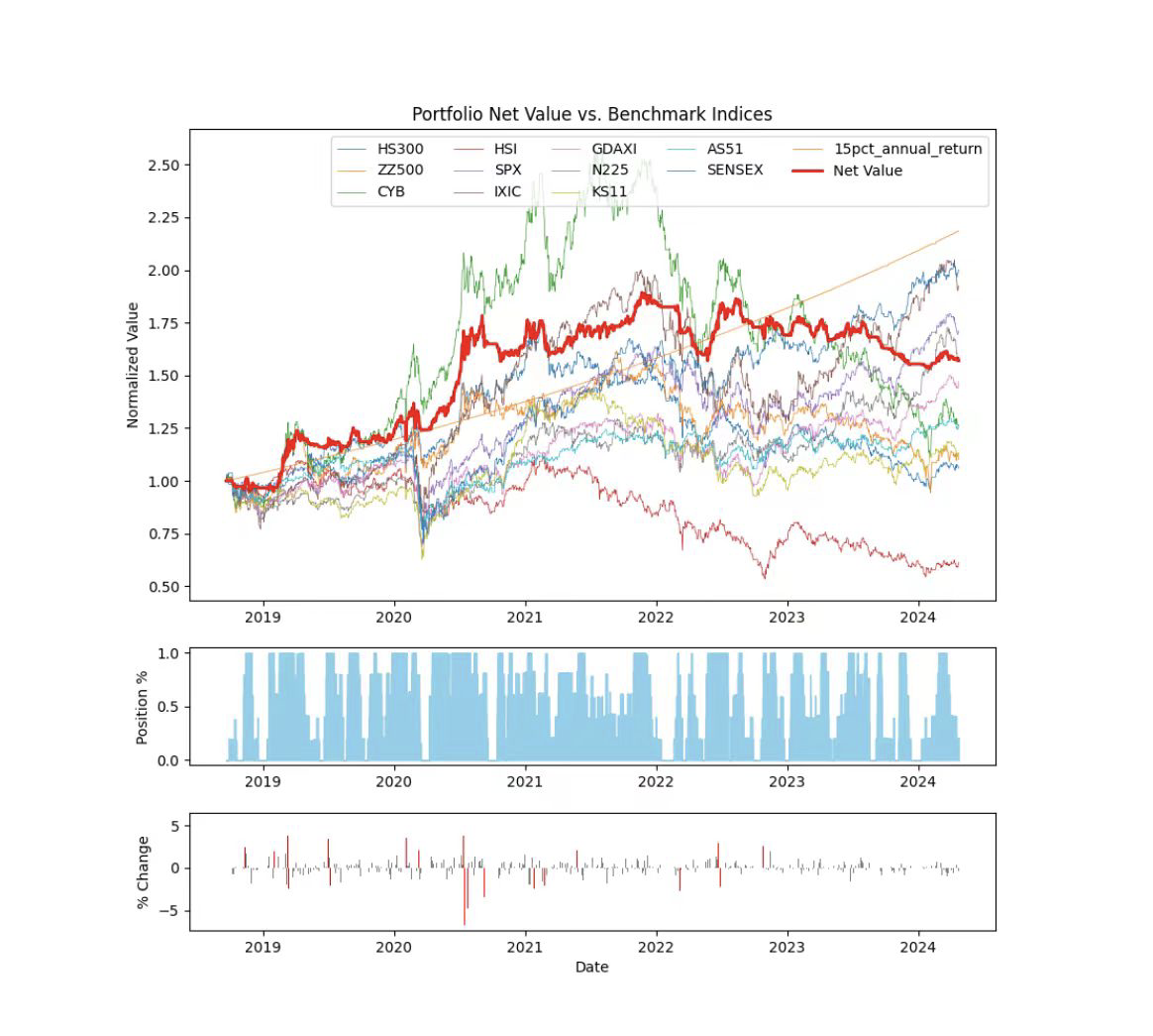 组合净值按照基金计算净值的方式来计算,同时与全球主流指数进行对比,而不仅限于本市场指数。这样做的目的是使组合能与全球所有主流市场对比,展示交易策略的全球有效性。