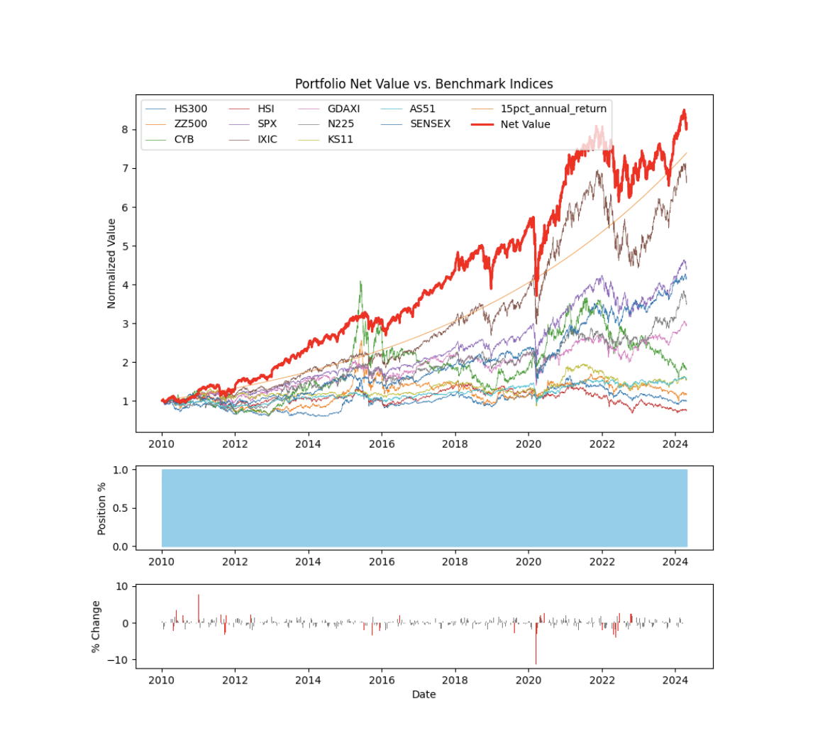 沪深300(000300.SH):代表沪深市场前300家规模最大且流动性好的股票。中证500(000905.SH):包含沪深市场规模较小的500家公司,反映中型企业的整体情况。创业板(399006.SZ):聚焦中国深圳交易所的高新技术和成长型企业。恒生指数(HSI):包含香港交易所最大的50家公司,是评估香港市场表现的主要指标。标普500指数(SPX):涵盖美国500家最大公司的股票表现,广泛用于评估美国股市的整体健康。纳斯达克指数(IXIC):主要由美国科技股组成,展示科技行业的表现。德国DAX指数(GDAXI):包括在法兰克福交易所上市的30家德国大型上市公司。日经225指数(N225):代表东京证券交易所上市的225家主要公司的表现。韩国综合指数(KS11):涵盖韩国首尔证券交易所主要上市公司的表现。澳大利亚标普200指数(AS51):反映澳大利亚证券交易所前200家主要上市公司的表现。印度孟买SENSEX指数(SENSEX):包括在孟买证券交易所上市的30家主要公司。15%年复合收益率基准:以15%的年复合收益率作为对比基准,超过此基准的组合表现被视为非常优秀,长期维持这一水平具有挑战性。