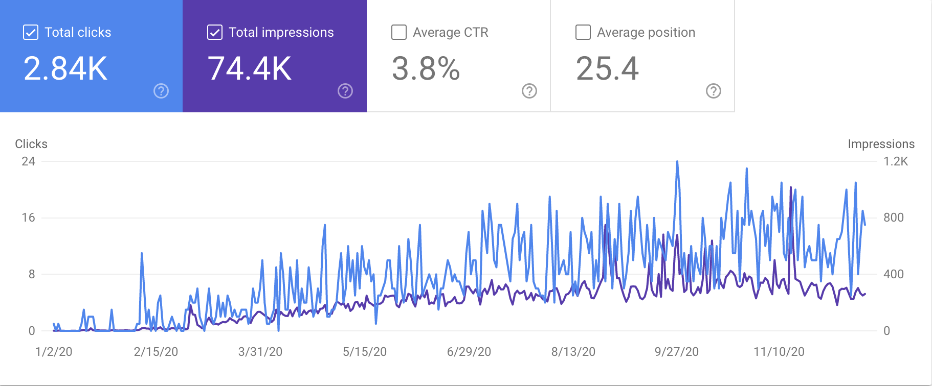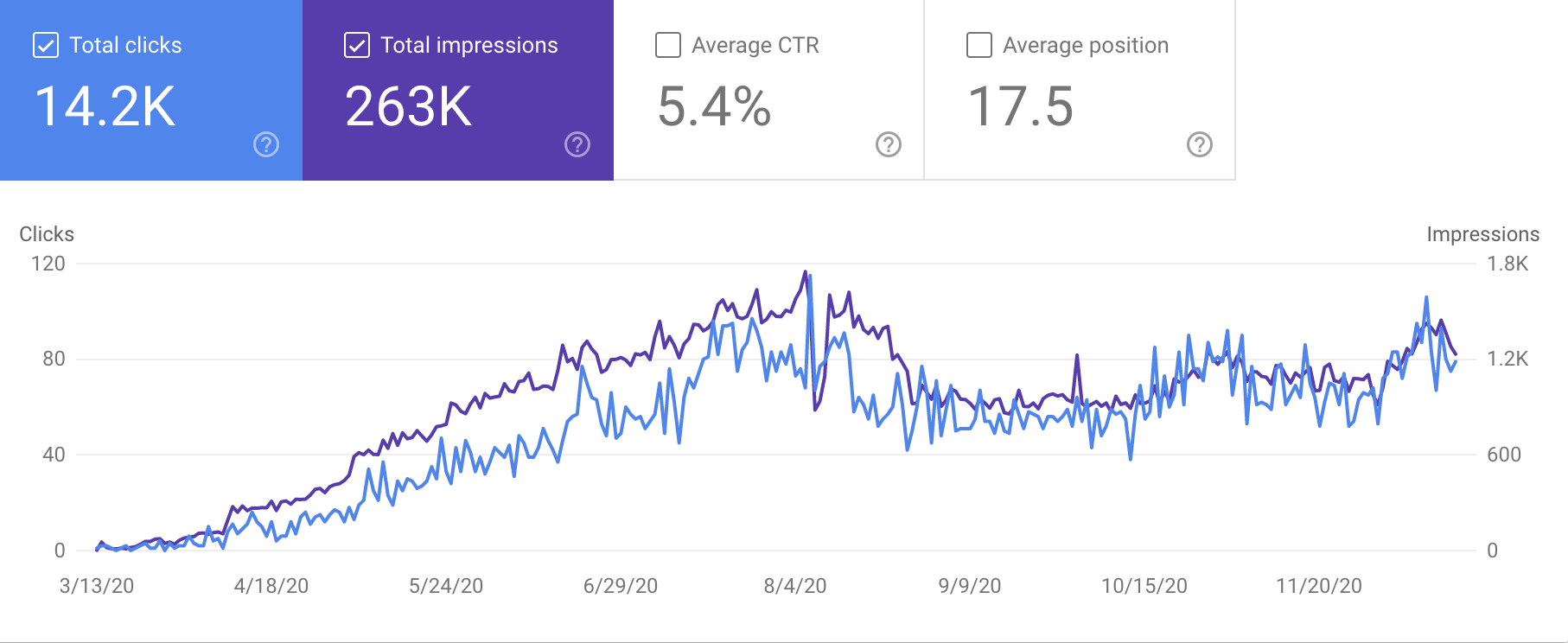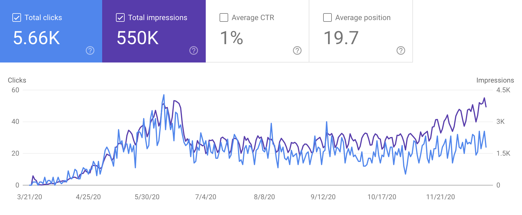 从 Google Search Console 上看总展示次数和搜索点击次数在逐渐提高。