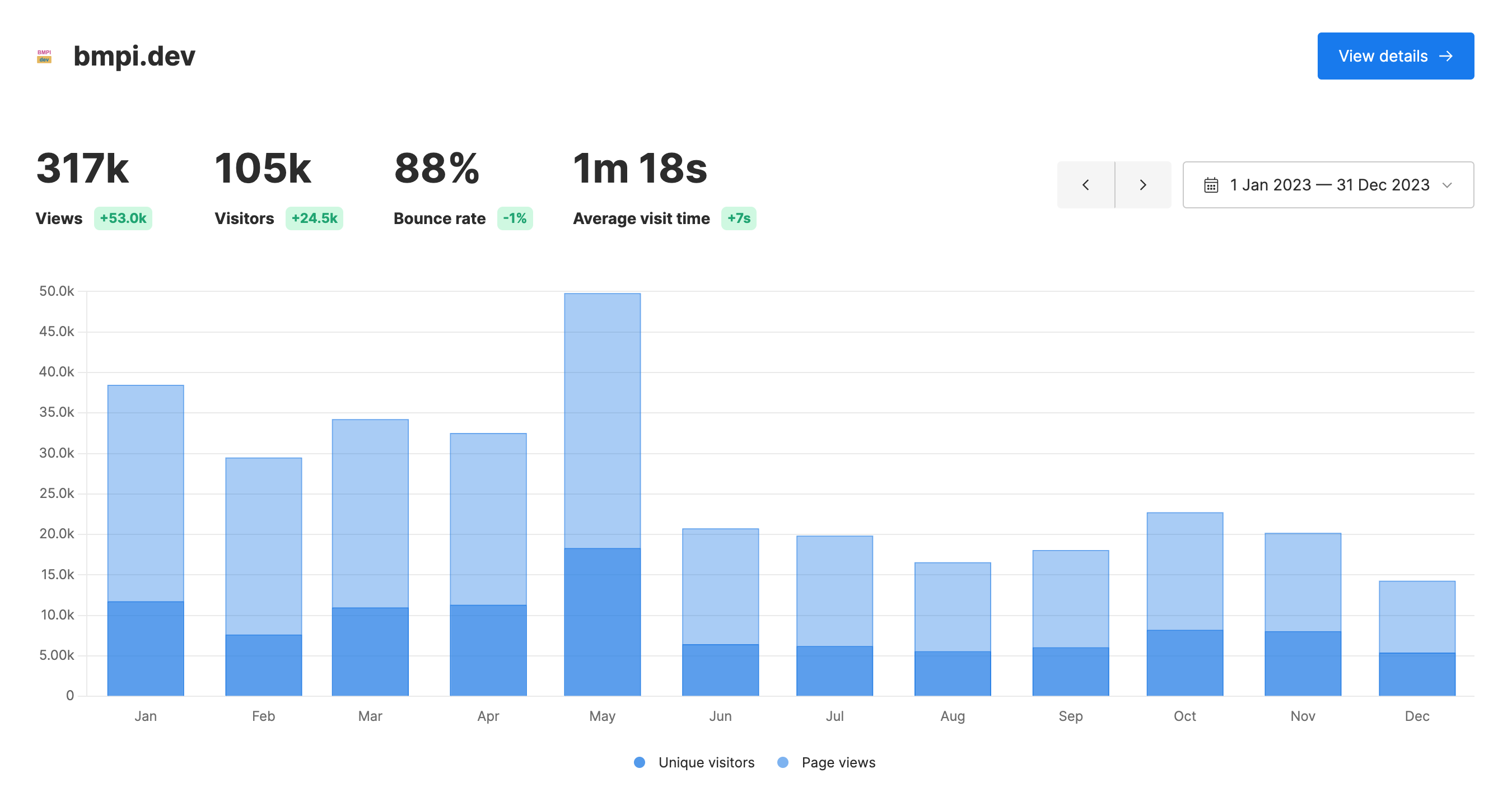 2023年博客的总访问量有317K,总访客量有105K。数据上较上一年下滑了一些,但考虑到在内容写作上明显减少了,这个数据还是可以接受的。