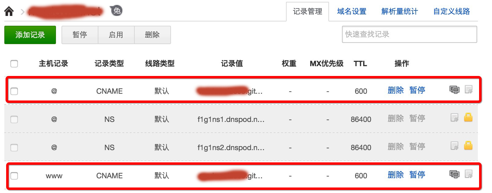 毕竟 http://username.github.io 这种域名无法体现我们对逼格,可以在Godaddy或者万网注册一个域名去,可以以你的名字来注册,一般短的都注册不到了。万网的域名如果托管到阿里云到话需要备案,至于备案流程的话阿里云会有相关的流程帮你做,大概需要半个月之久。备案后我们可以在域名管理里把域名解析到 http://username.github.io ,如果觉得万网的DNS不好的话可以把DNS解析放到DNSNode上面去,然后在里面设置CNAME子域名。