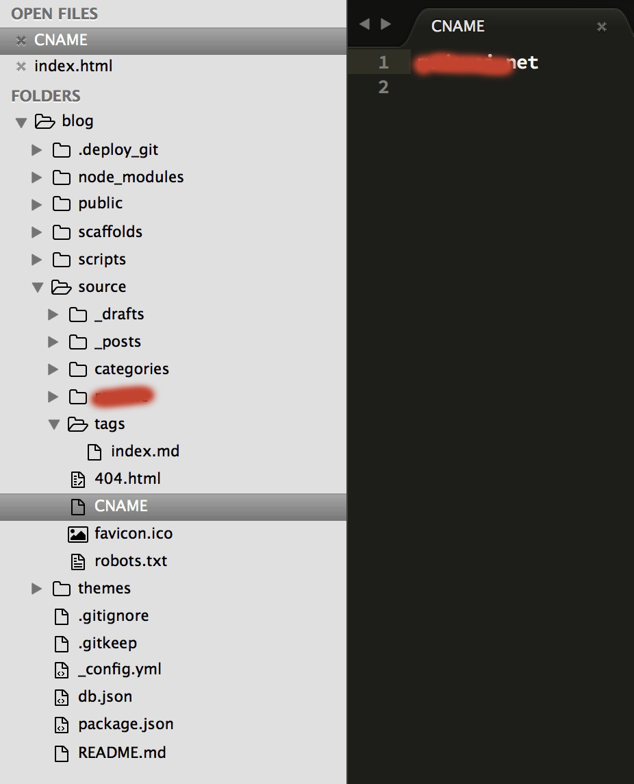 然后在blog目录里面的source目录下新建一个CNAME文件,文件内容就是你自己的域名。