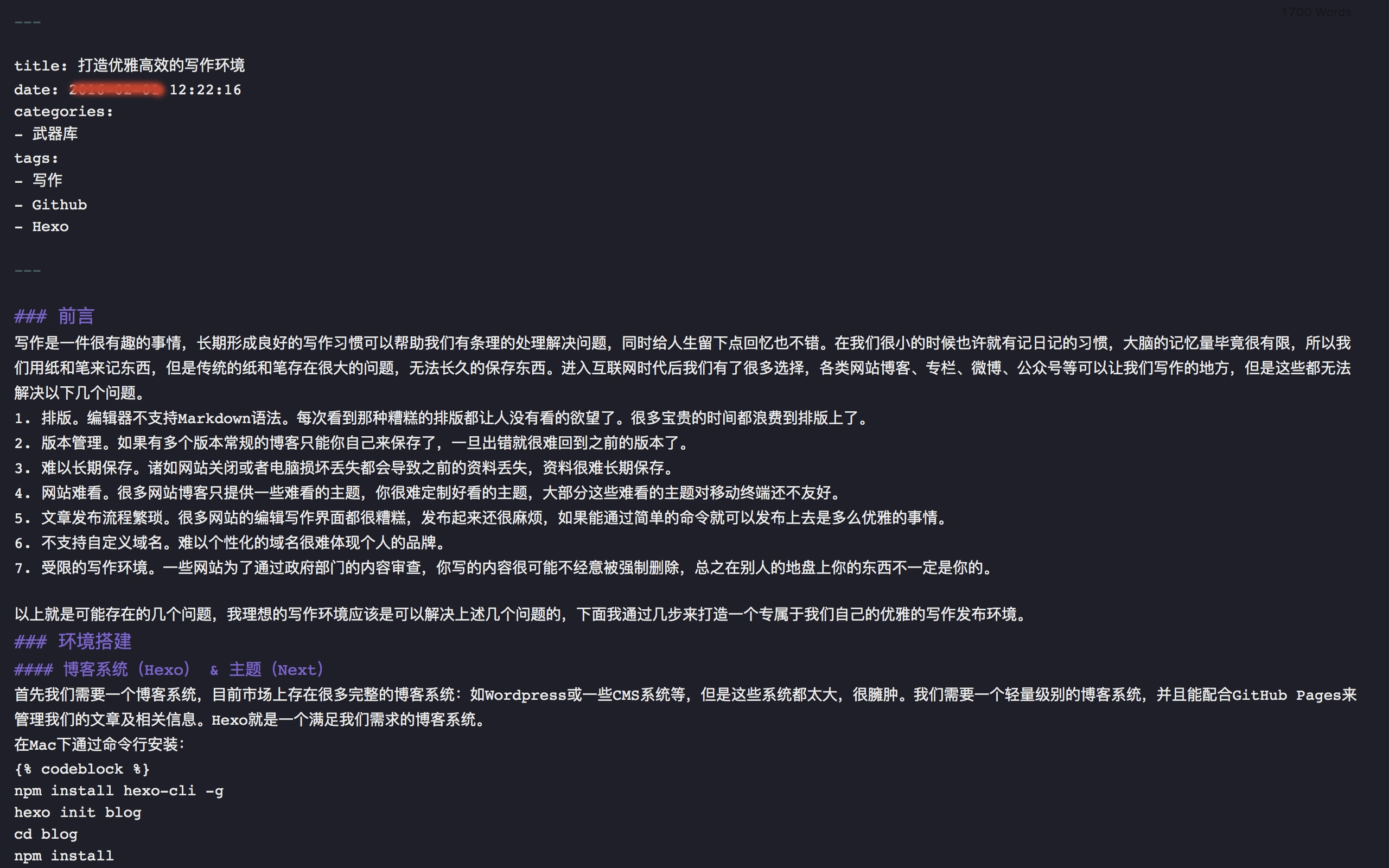 - 受限的写作环境。一些网站为了通过政府部门的内容审查,你写的内容很可能不经意被强制删除,总之在别人的地盘上你的东西不一定是你的。 以上就是可能存在的几个问题,我理想的写作环境应该是可以解决上述几个问题的,下面我通过几步来打造一个专属于我们自己的优雅的写作发布环境。