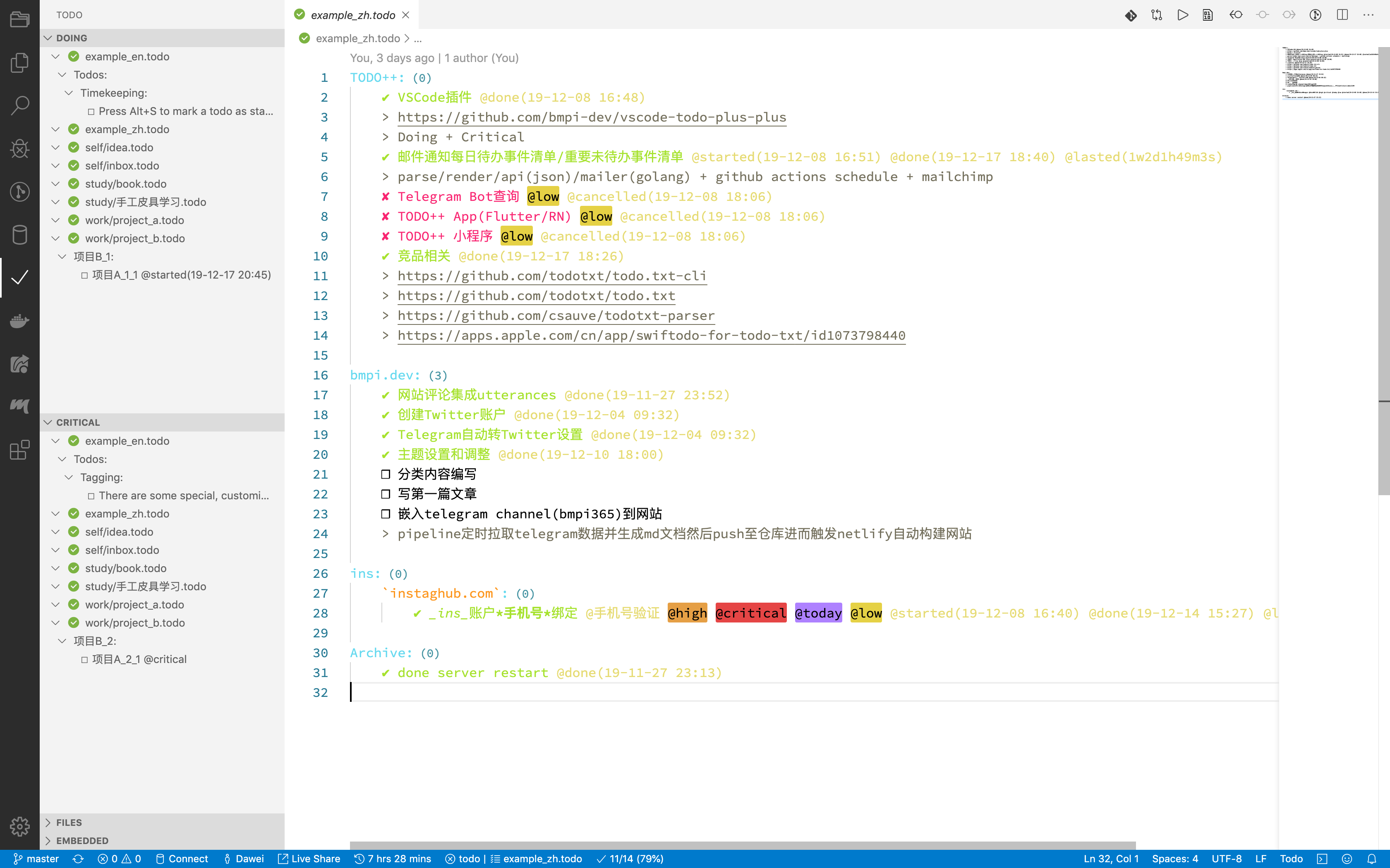 首先解释下为什么会是这个组合?作为一个开发,平日用到最多的就是编辑器。之所以选择VSCode,是因为他的生态比Emacs好,启动速度在安装很多插件后还是很快,插件开发简单,背靠微软大山,软件使用体验还是很不错的。刚好在里面有个有个Todo+7的插件,这个插件支持一种todo后缀的纯文本格式的文件,这种文件很容易新建一个待办事项,支持项目嵌套,使用快捷键标记待办事项状态,如下图所示: