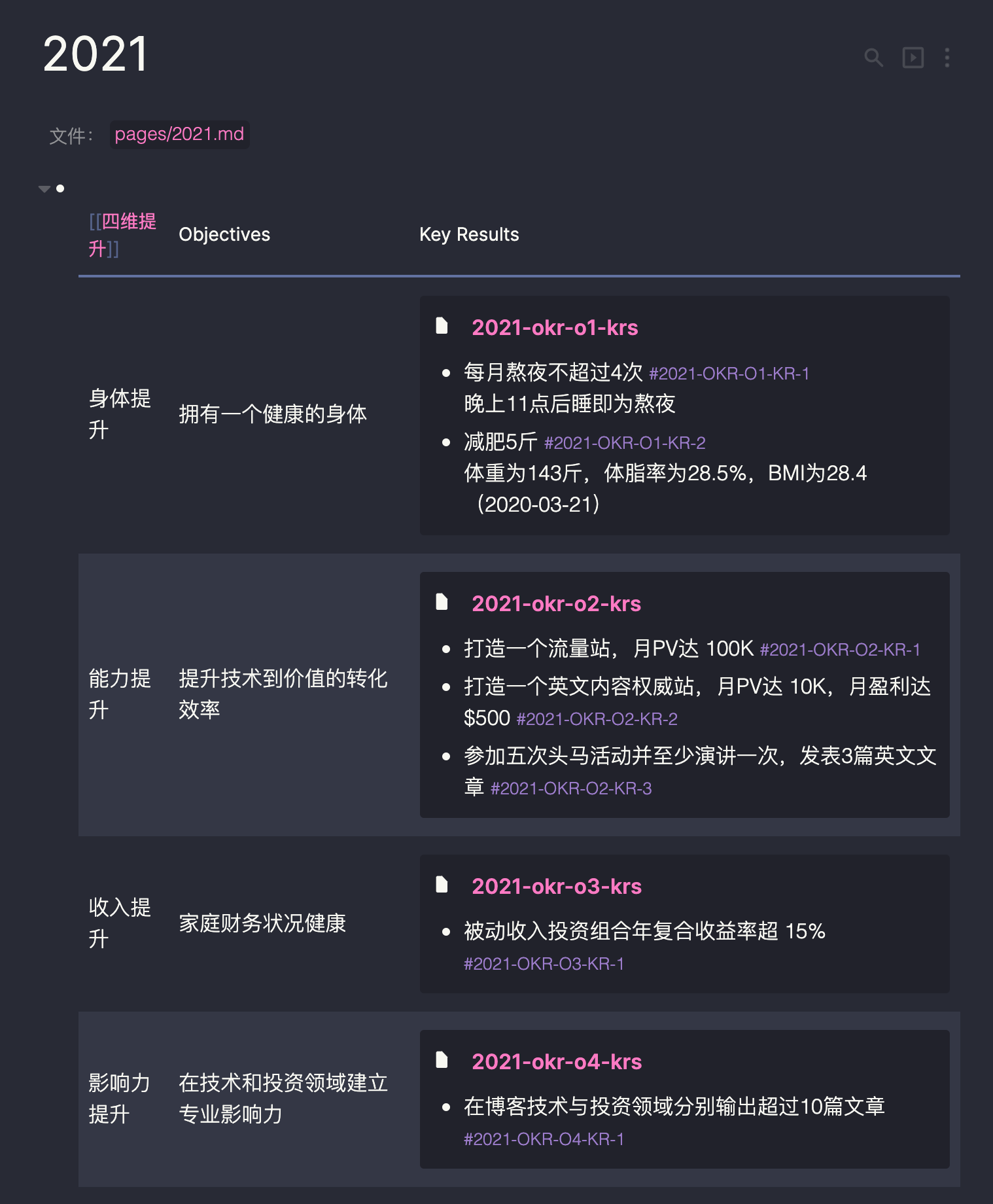 如何用 Logseq 实现这些流程呢?先建立一个 2021 的页面,然后用 Markdown 表格实现 OKR 的内容: